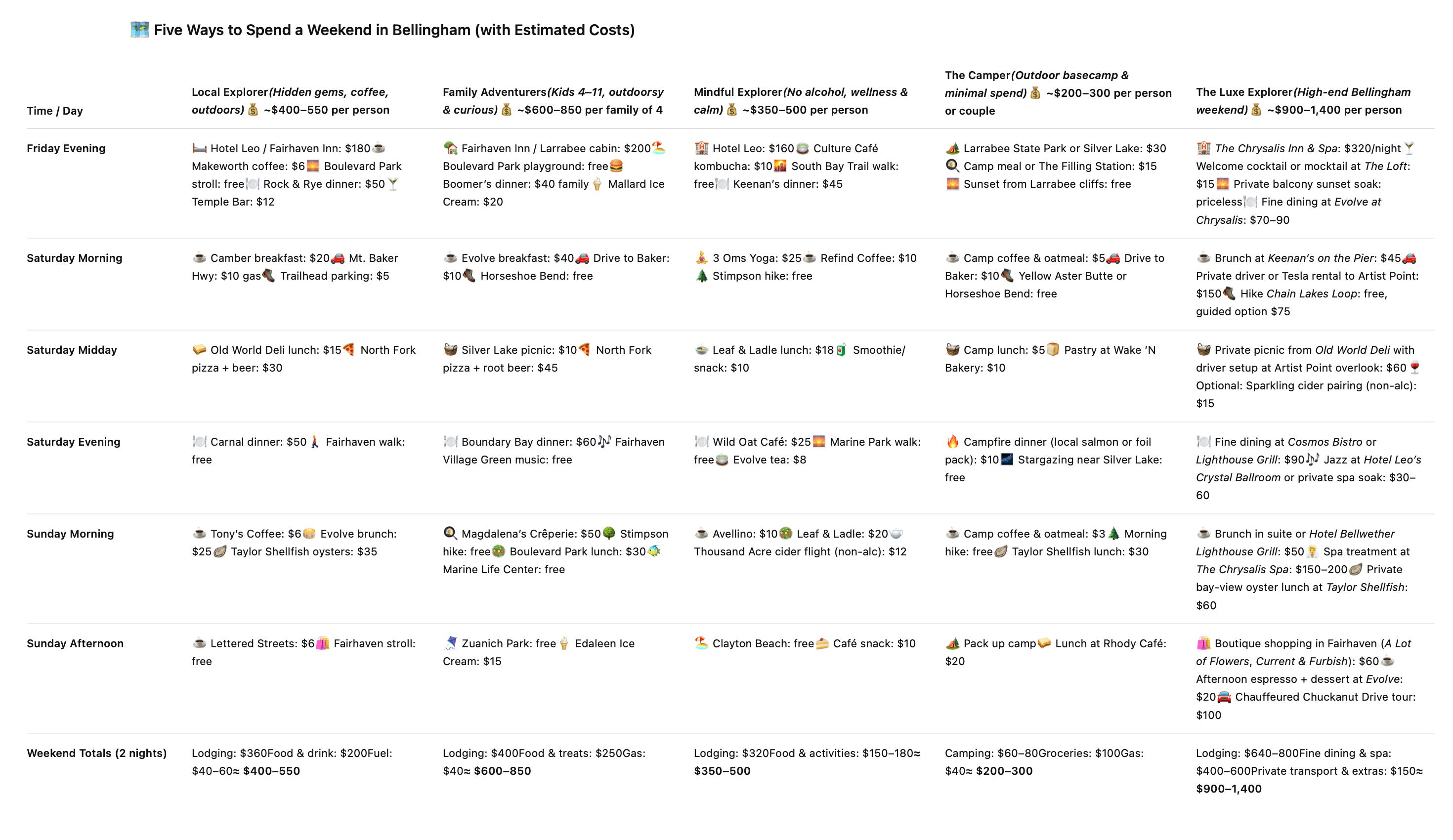Below are five distinct ways to experience Bellingham — from hidden-gem explorers to luxe travelers — each with activity ideas and estimated weekend totals (Fri–Sun).